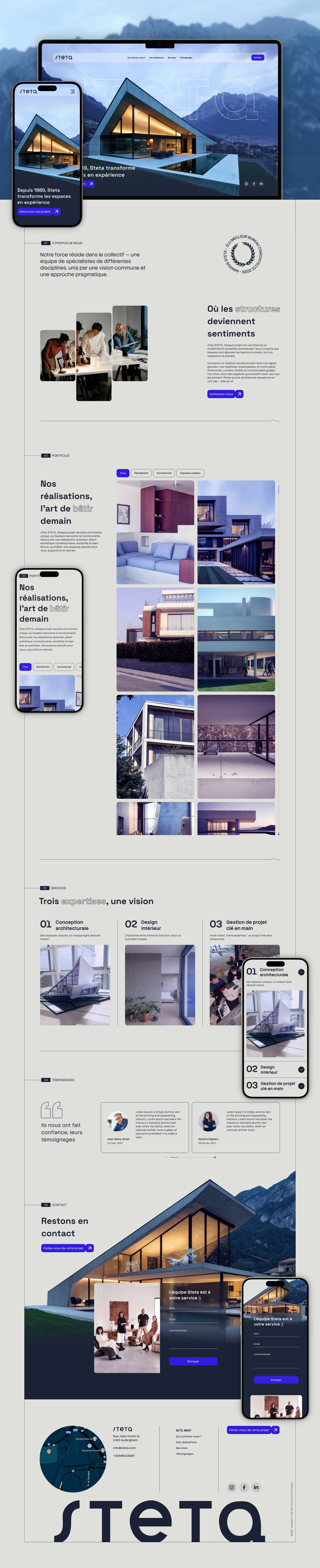Conception d'un site one-page en storytelling pour Steta, bureau d'architecture fondé en 1989. Le design adopte une esthétique minimaliste — typographie forte, palette sobre et visuels immersifs — pour traduire l'excellence et le savoir-faire de l'agence, du desktop au mobile.
